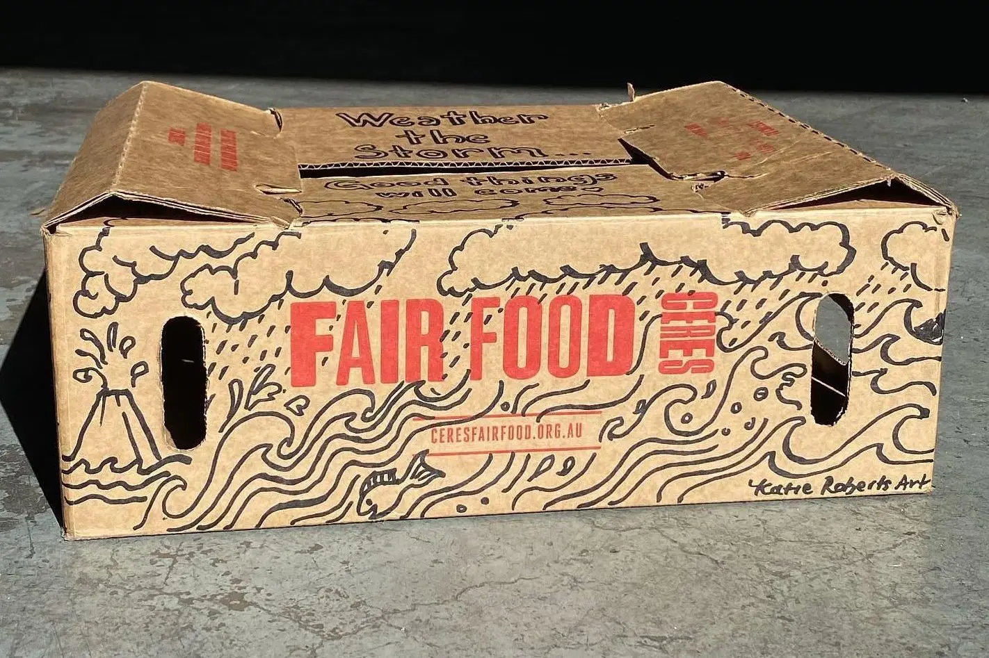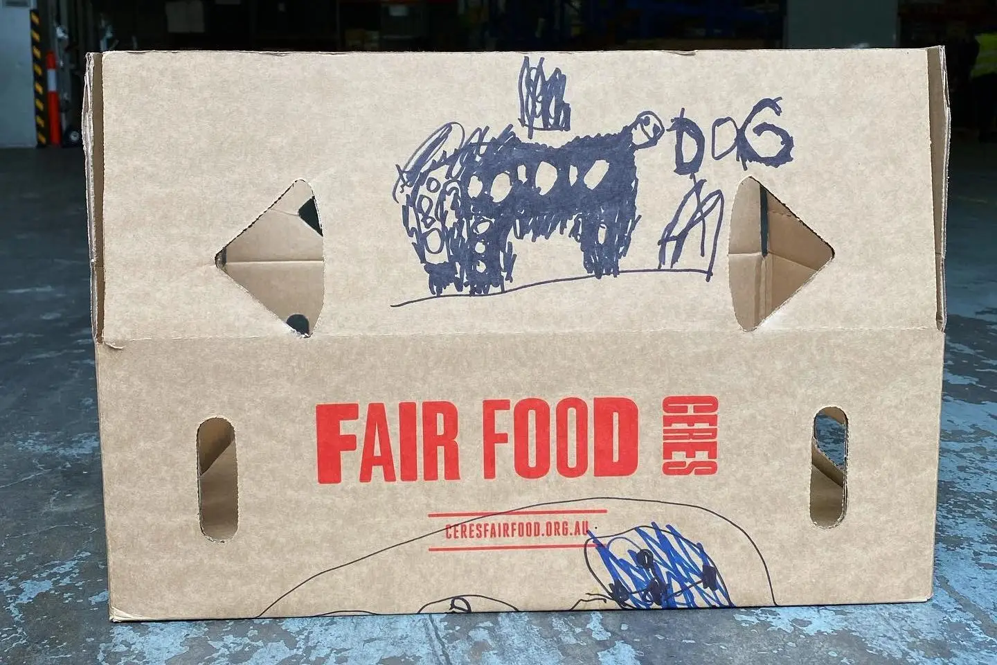 A few days later, arriving with the beginning of Spring, a box appeared covered in pictures of fruit. It was followed by another and then another and then for the next month a steady stream of decorated boxes flowed into the Fair Food warehouse warming the hearts of all who saw them.