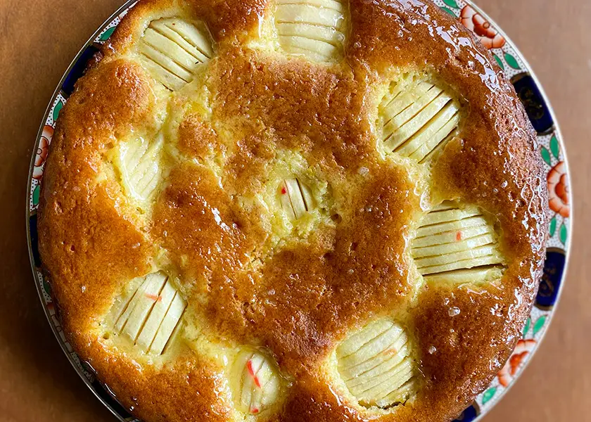 Place peeled, halved and cored apples cut-side-down on a chopping board. Use a knife to create parallel thin slices, but only cut halfway through each apple so that the apples stay intact. Don’t fret if you cut through, you can just reassemble the halves on the cake in a few minutes.