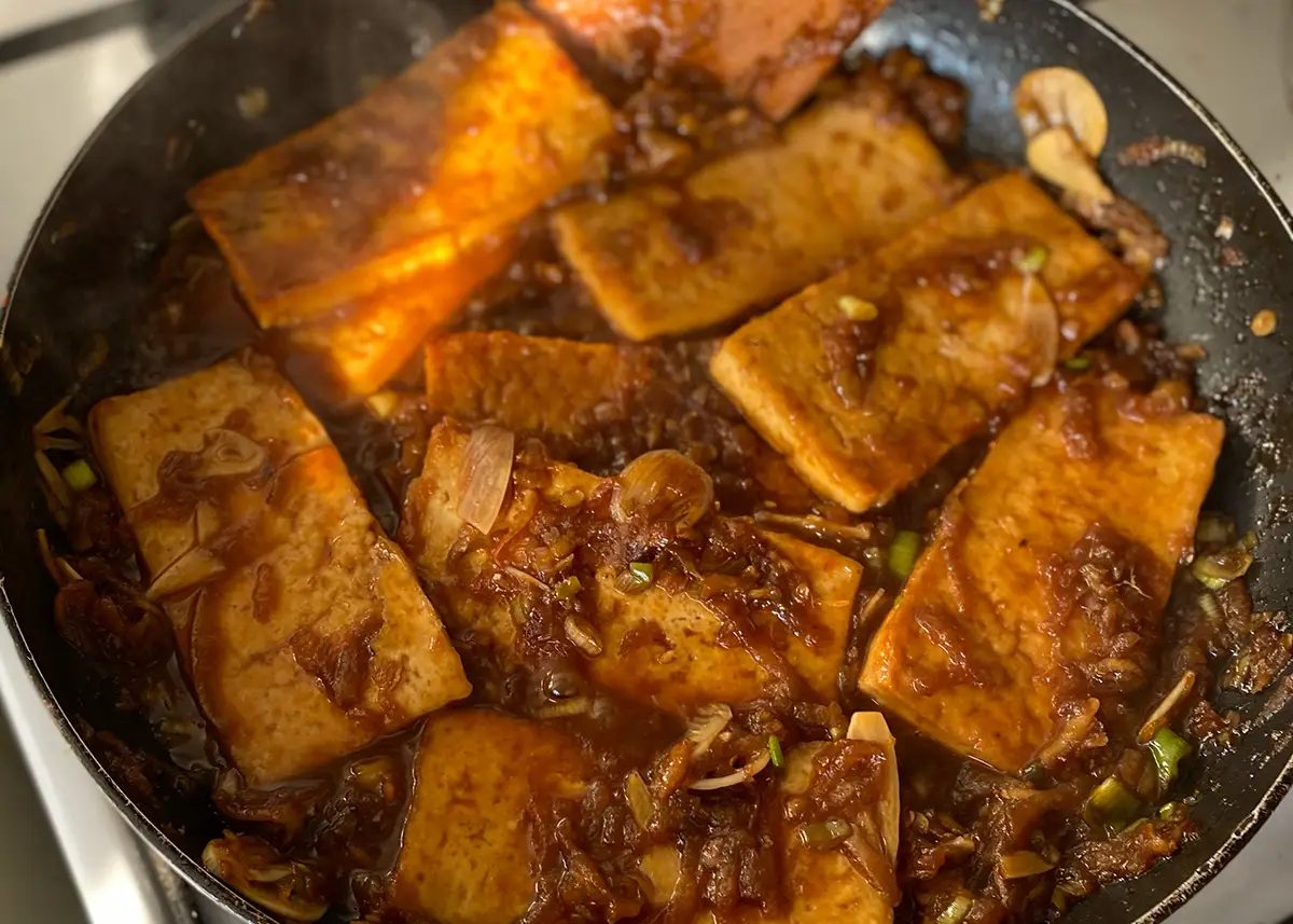 This braised tofu recipe, which is a riff on the Korean classic, Dubu Jorim, absolutely rocks. All you gotta do is mix the sauce ingredients, fry off the tofu, then bung it all in together for 5 mins. The truly eye opening bit is adding a whole grated pear – mellow sweetness amongst the spicy, funky, savoury flavours. Like we said, rockin’!