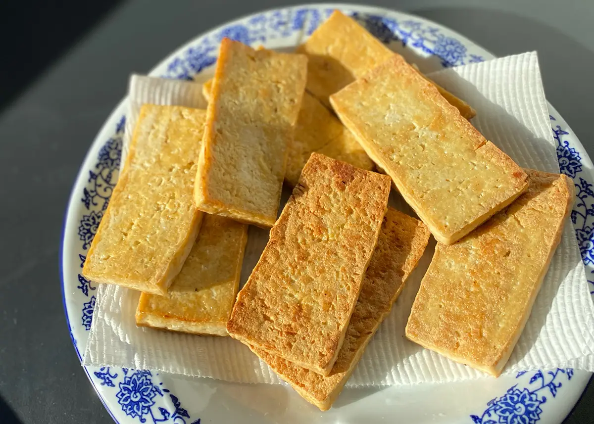 Coat the bottom of a large non-stick frying pan with the sunflower oil and line a plate with a couple of sheets of paper towel. Heat the oil until it reaches smoking point and fry the tofu slices for 8 minutes until golden on both sides. Remove the tofu to the plate, allowing the paper to absorb some of the excess oil.