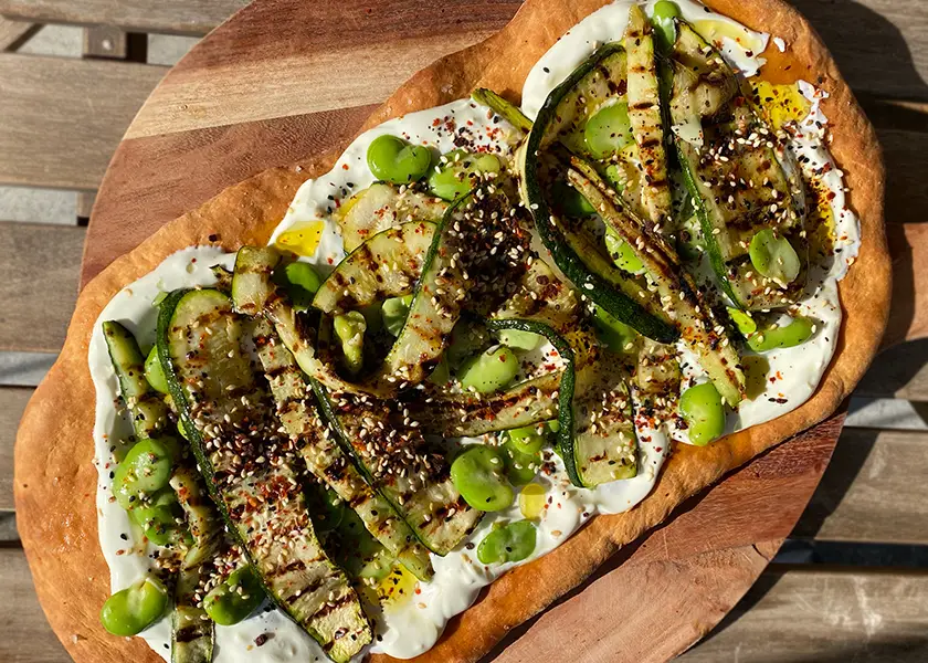 This recipe was sent in by Isabella, a customer who got some gorgeous broad beans and zucchini in her box and wondered what she’d do with them. There is no rising time for the dough and minimal cooking time for the toppings, so the whole thing comes together fast and with a fresh summery flair! We love this recipe because you can easily change things to suit tastes and dietary requirements. Chop it up into slabs, pour yourself a cold drink and lap up that al-fresco feeling – cheers, Isabella!