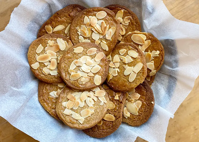 Brush with egg white and sprinkle with flaked almonds. Bake for 12 minutes, rotating the sheets halfway through, until golden brown and the almonds are toasted. Remove from the oven and set aside for 10 minutes and then let cool completely on wire rack.