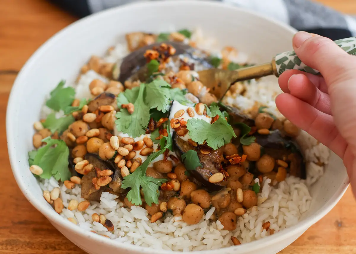 This Creamy Chickpea & Eggplant Stew is a hearty and affordable plant-based dinner that’s ready in less than 30 minutes! Made with eggplant, chickpeas, coriander and a creamy coconut base, it’s rich, mildly spiced and the perfect cosy family dinner on the last of these cool Spring nights. It’s delicious served as-is, but also customisable with toppings – I love to jazz it up with a squeeze of lemon, some pine nuts and yogurt to finish. If you like a bit of heat, you can also add some chilli oil. Serve it with your carb of choice – white rice and mashed potato are excellent options – or soak up the sauce with some slices of crusty grilled sourdough for a wholesome, comforting dinner. Leftovers will keep in the fridge for up to 3 days and it reheats well on the stove or in the microwave (mix through an extra splash of water if the sauce thickens too much when reheated). Enjoy! Recipe contributed by Glow Diaries