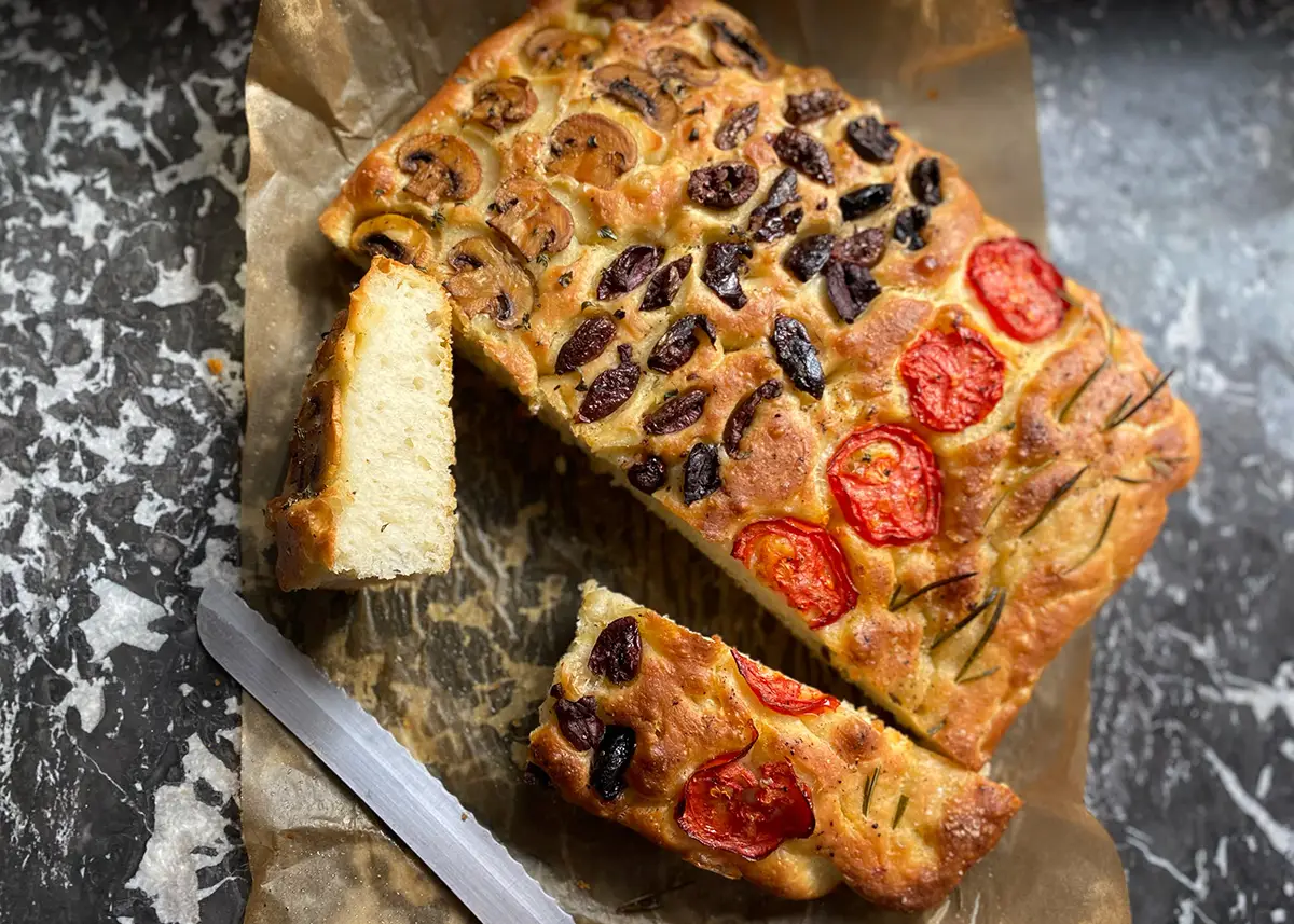 There are many ways to make focaccia, some are more labour intensive than others – this one is remarkably simple. There’s no kneading in this recipe, but it does include a 12 hour rest period that helps develop a delicious flavour in the dough; we suggest starting the night before, so you’re not watching the clock. We’ve topped ours with olives, mushrooms, tomatoes, herbs and a liberal sprinkling of sea salt. You could add thinly sliced potato, zucchini, or keep it simple – just salt and rosemary. Whatever you decide, be sure not to skimp on the olive oil, it’s essential for the texture and flavour of this crowd-pleaser.