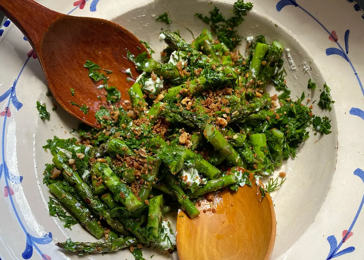 In a large serving bowl combine oil, lemon juice, salt, pepper and chilli if using. Add in herbs and stir to coat. Add in Asparagus and toss. Dot with cheese, if using and finish with the crunchy breadcrumb topping.