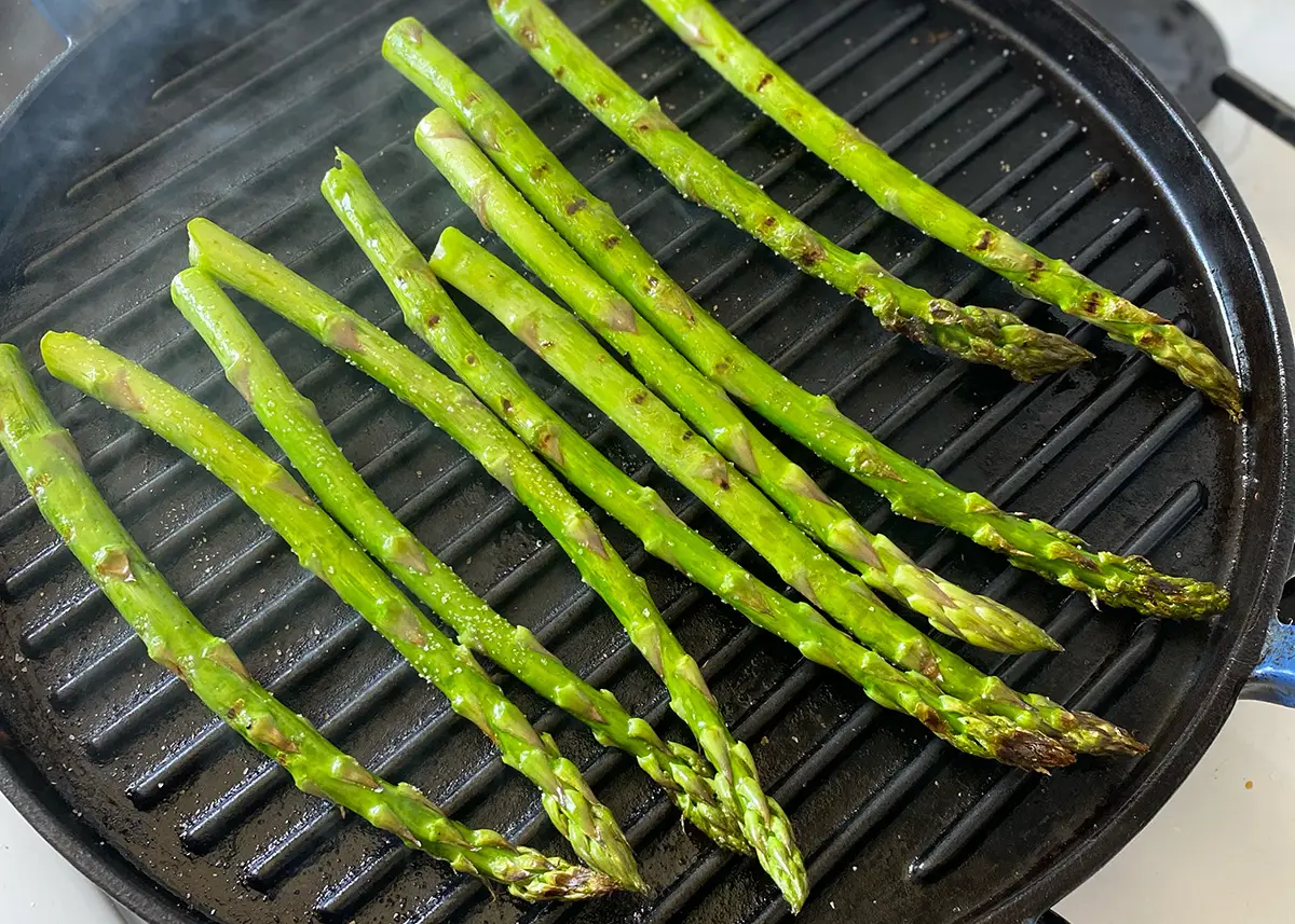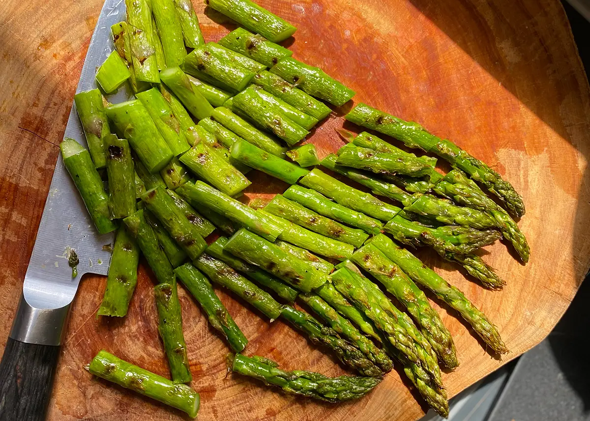 Heat bbq or griddle pan over medium high heat. Toss asparagus in 2 tbsp olive oil. Working in batches if necessary, grill asparagus for about 6 mins until tender and charred on all sides. Remove from heat and set aside. Alternatively, you can roast the asparagus at 200°C for about 15 minutes, tossing half way, until tender, but still crisp. Don’t overcook.