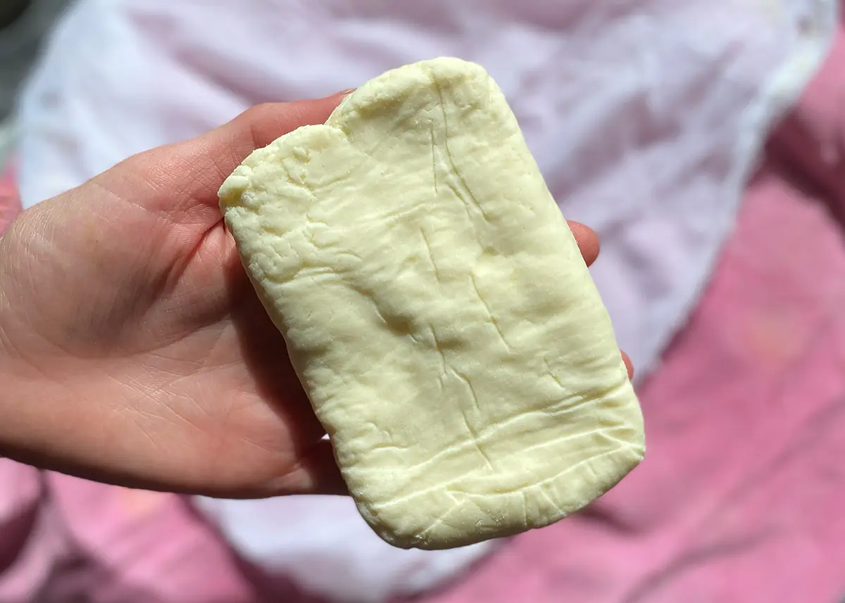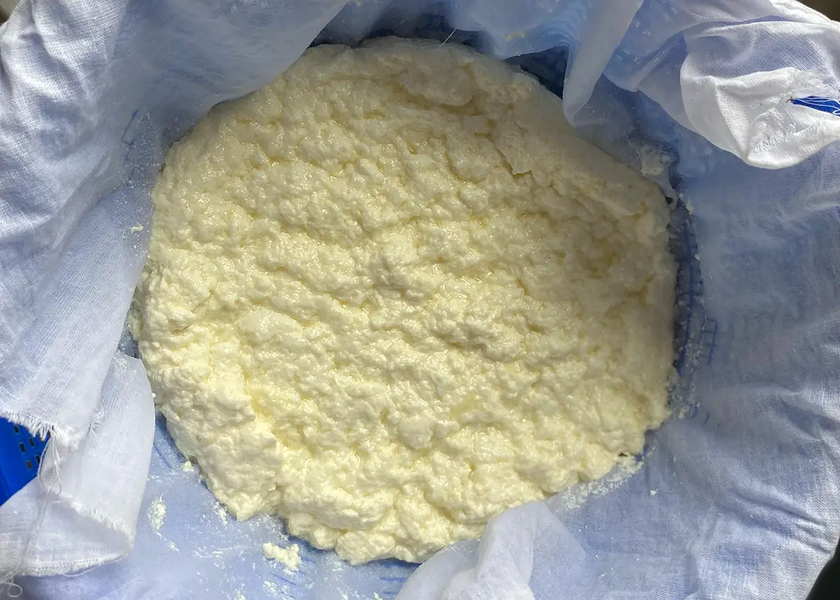 Wrap up the curds tightly and place a heavy object on top to leech as much liquid as possible. Let rest in the fridge for at least 2 hours or overnight.