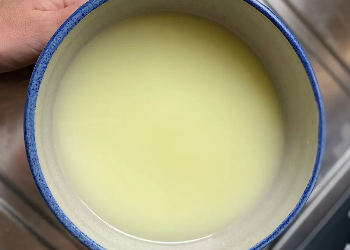 Once the milk has split fully, add a few cubes of ice as this stops it cooking further.