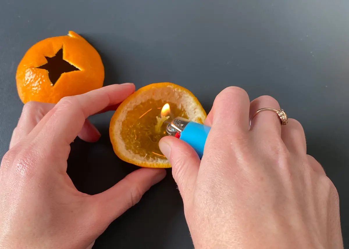 Starting with the top (stem end), use your fingers to gently peel the skin away from the side of the fruit, keeping the shape intact. Next, carefully twist the skin and pull away from the fruit, this will allow the inner stem to remain intact and that is what you use for the wick!