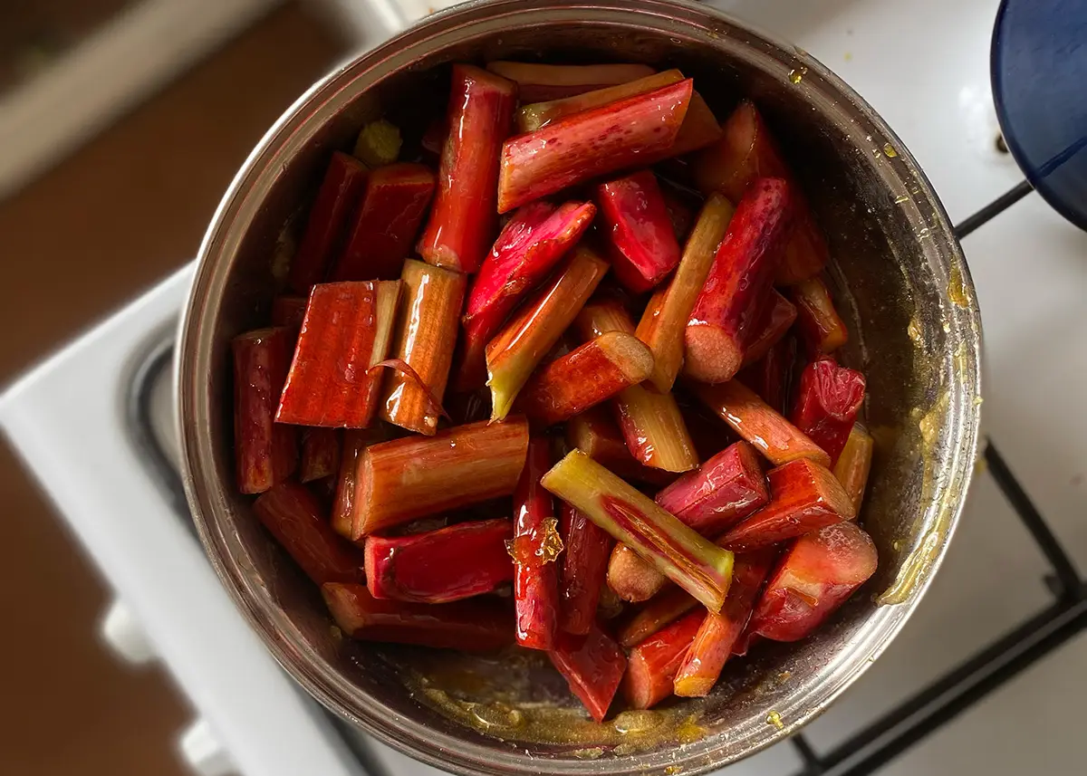 Once the burnt caramel is made, dump in your rhubarb stalks and stir to coat them all in the glorious sauce. Then put a lid on and leave it for 4 mins. Take the lid off, stir, then return the lid. Do this until the rhubarb has completely disintegrated into a glorious compote – ours took about 20 mins.