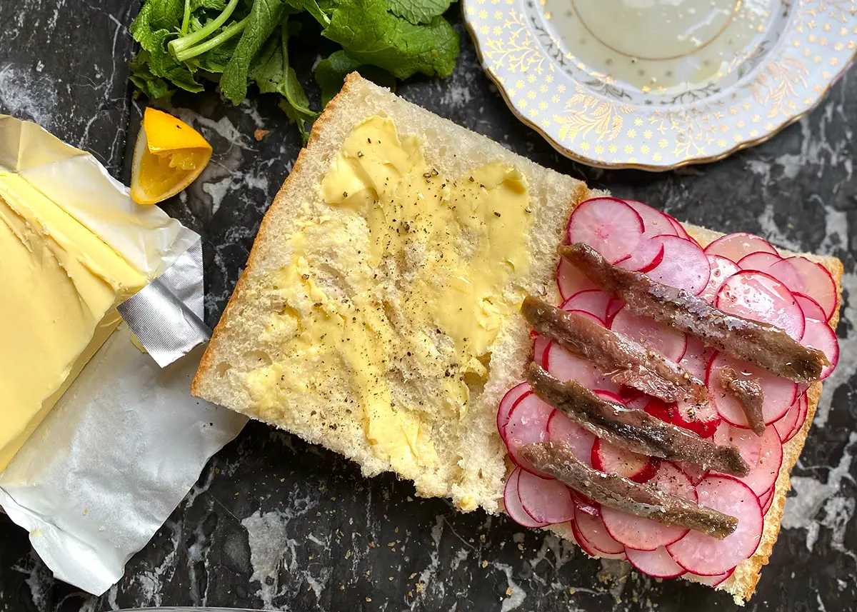 Halve your bread and butter it generously. Layer the radishes on one half, you wants looooots of radish! Add anchovies on top of the radishes, and season with salt, pepper and lemon.