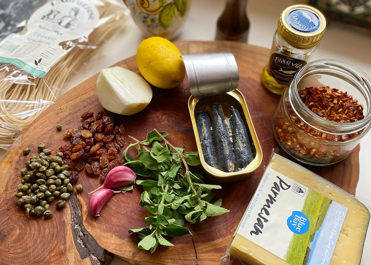 We’ve got new, sustainably caught South Australian sardines from Little Tin Co, so to celebrate we’re adding another sardine spaghetti to our collection (never too many). This is a weeknight winner, with most of the ingredients probably already in your pantry. At first, we questioned the inclusion of sultanas, but trust us, chopped fine you don’t physically notice them, and their subtle sweetness takes the sauce to perfectly balanced territory!