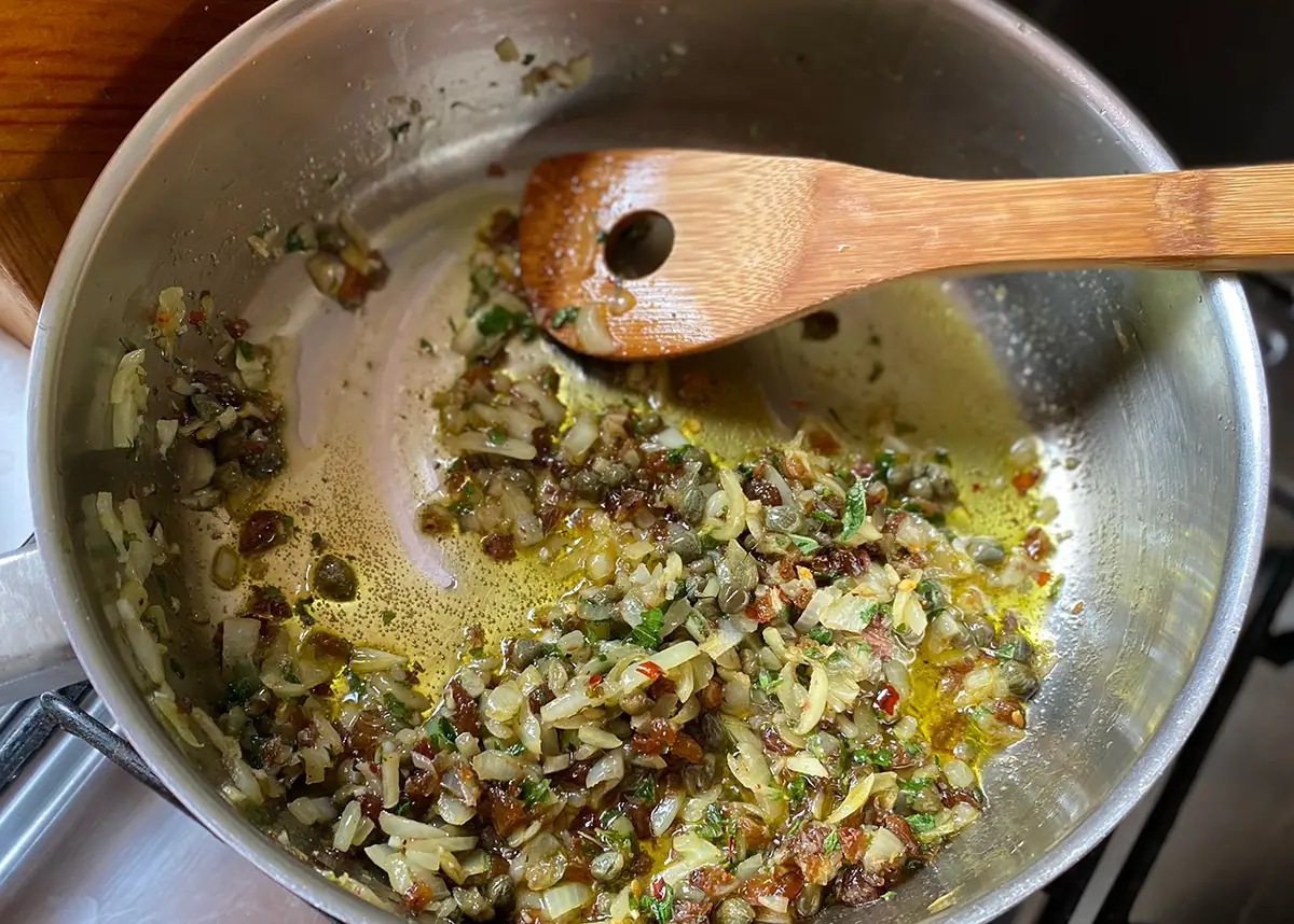 Add the chilli flakes (if using), anchovy fillets, oregano, sultanas, capers and tomato paste and fry for a further minute. Follow with the crushed tomatoes and stir to combine. Cook the sauce on a low heat while you boil the pasta.