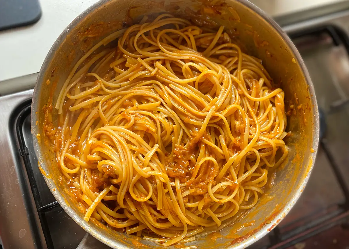This pasta is all about the shallots, cooked down in a bath of olive oil to a jammy, caramelised paste. Tomato paste is there for tanginess, and anchovies for saltiness, but they serve more as background flavours to the sweetness of the shallot. This recipe makes enough shallot mixture for a double batch of pasta, or simply keep it in the fridge to spoon over fried eggs, or to serve underneath crispy chicken thighs or over roasted root vegetables like carrots or sweet potatoes.