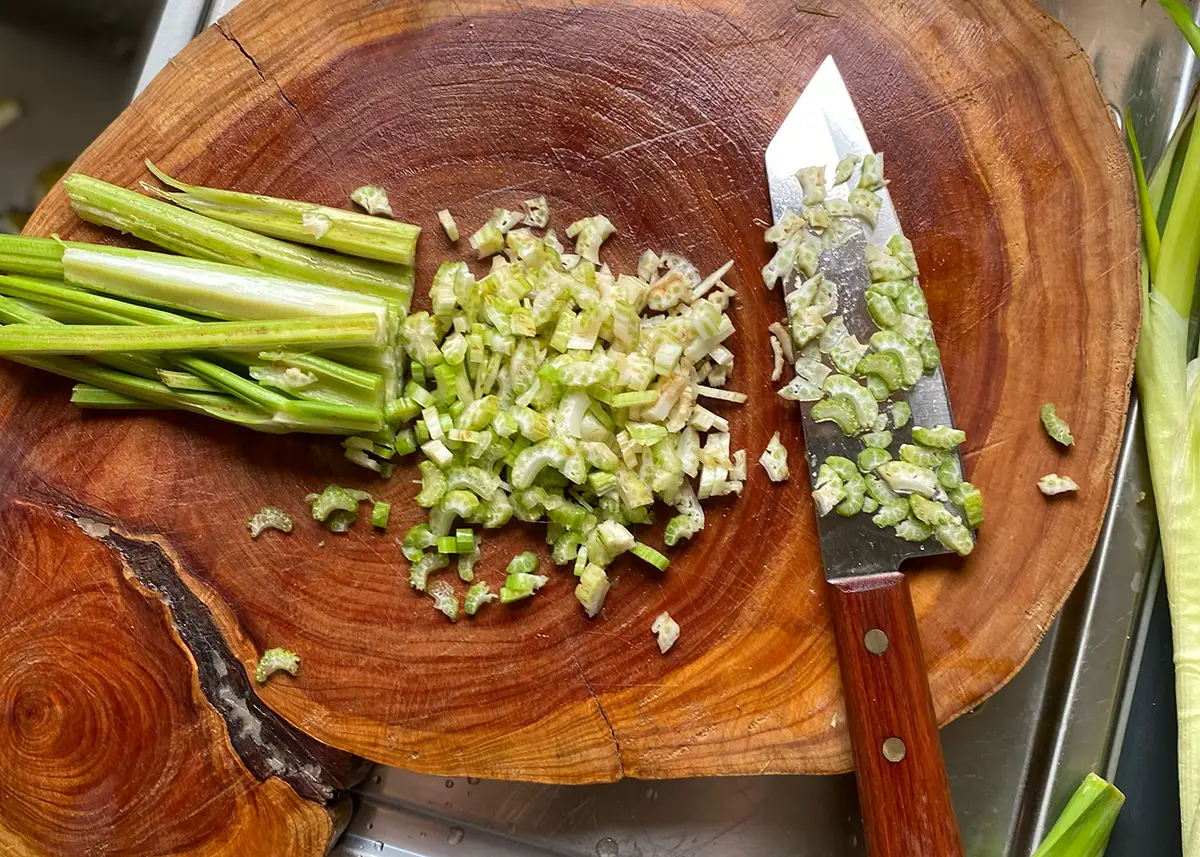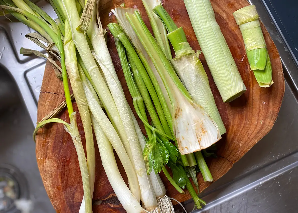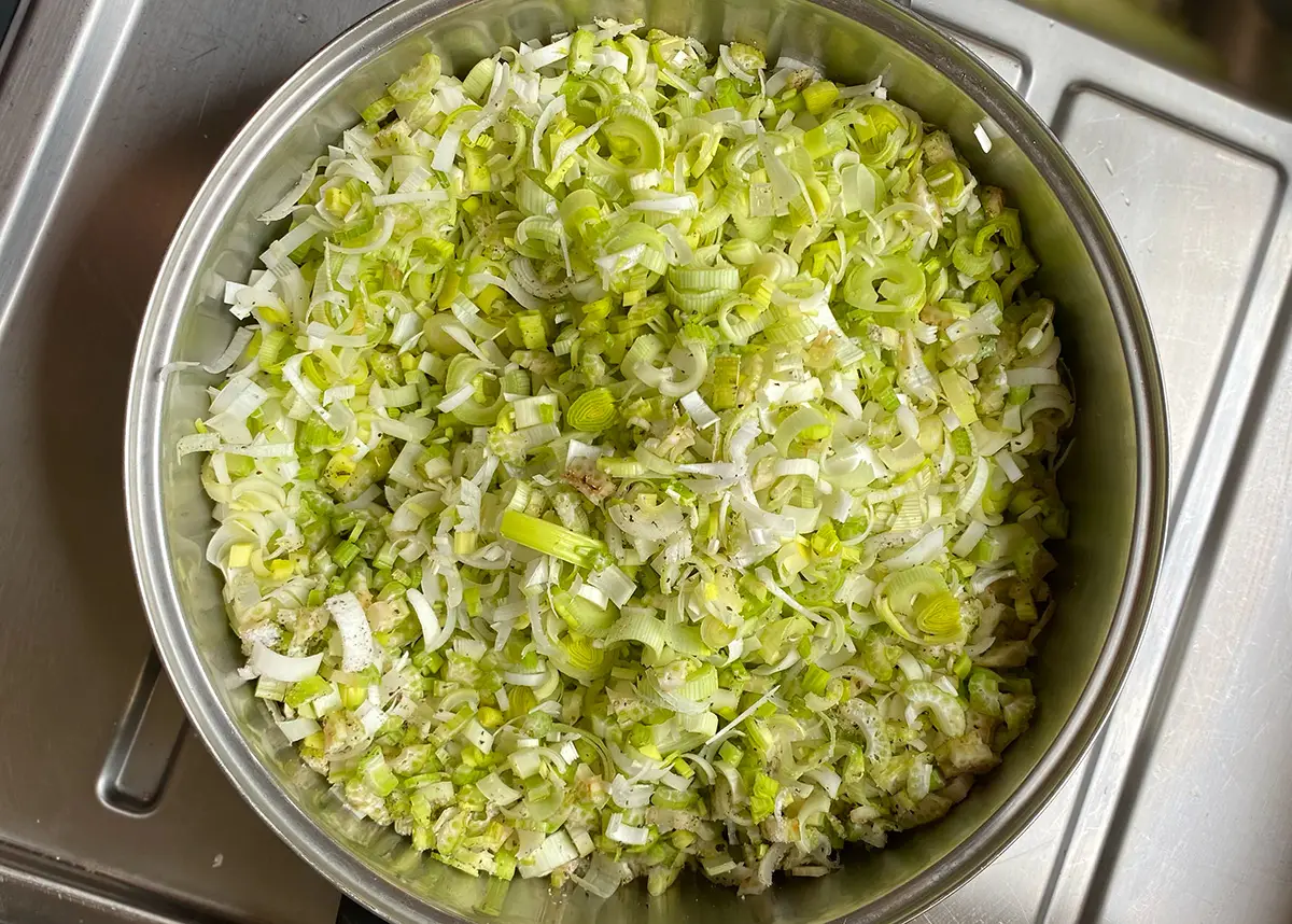We often find bendy, dry, mottled veg at the bottom of the crisper. The usual suspect are: spring onions, leek, fennel and celery. It’s hard to find inspiration in these forgotten veg, but now we have the solution: SOFFRITTO-ISH! Technically this isn’t a soffritto, or a mirepoix, but we’ve borrowed similar techniques and created a superb waste free cooking hack. We usually make a big batch, portion it out and freeze it for soups, stews, zucchini slice, savoury scones etc!