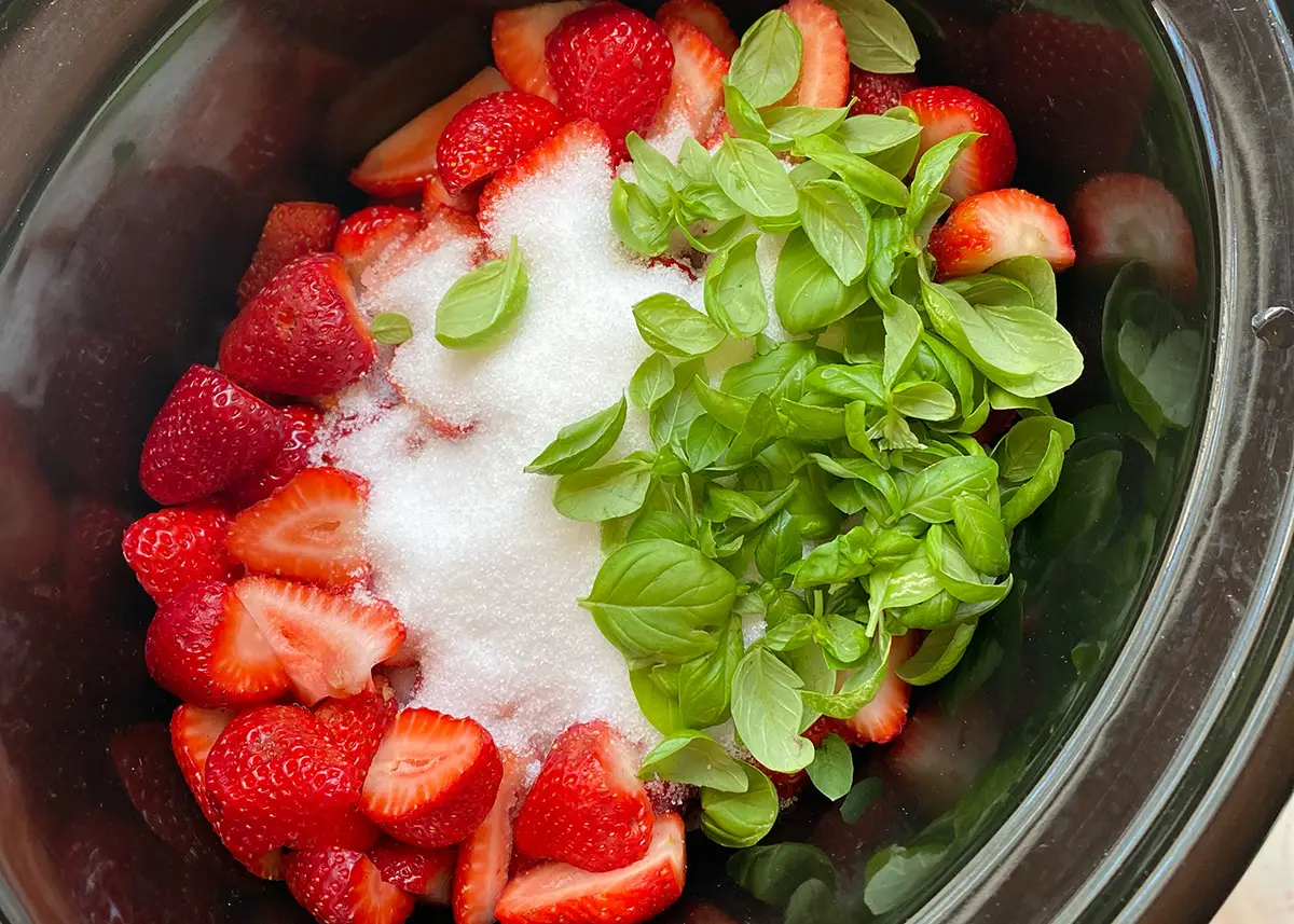 Stir strawberries, lemon juice, sugar, basil, and a pinch of salt together in the bowl of a slow cooker or a large pot. Cover and bring to a slow simmer, and cook very gently, on low for 1-3 hours*, until the basil has infused and the berries are soft with all their juice released.