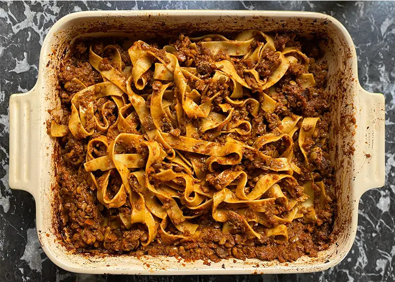 Sometimes you just need a spag bol or spag bol equivalent. This recipe delivers an incredible punch of umami flavour that will satisfy vegans and meat-eaters alike. It also happens to be extremely easy to throw together (all in one baking dish and in the oven) and can be served with pasta or used as the base for a lasagne or shepherd’s pie. It’s a new winter staple for us – give it a try and let us know what you think!