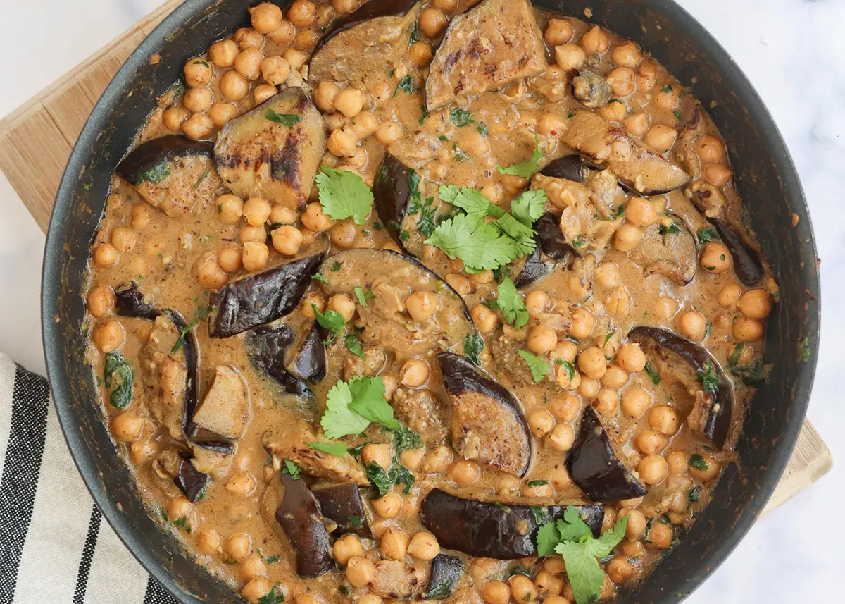 This Creamy Chickpea & Eggplant Stew is a hearty and affordable plant-based dinner that’s ready in less than 30 minutes!