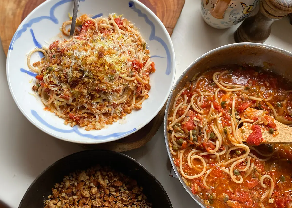 This pasta is all about the shallots, cooked down in a bath of olive oil, tomato paste and anchovies to a jammy, caramelised paste.