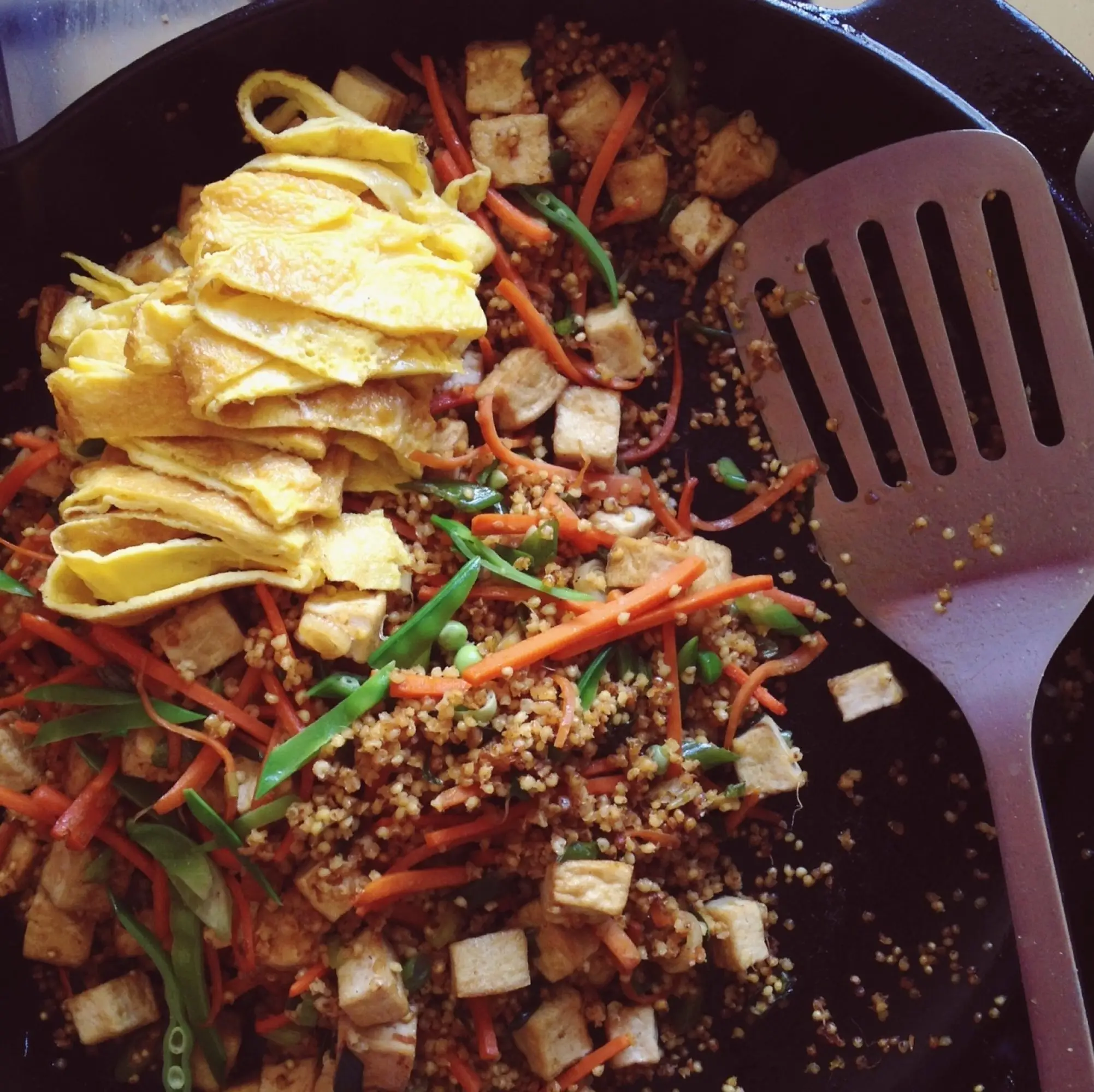 Delicious and simple millet fried ‘rice’ with omelette, tofu and spring veggies.