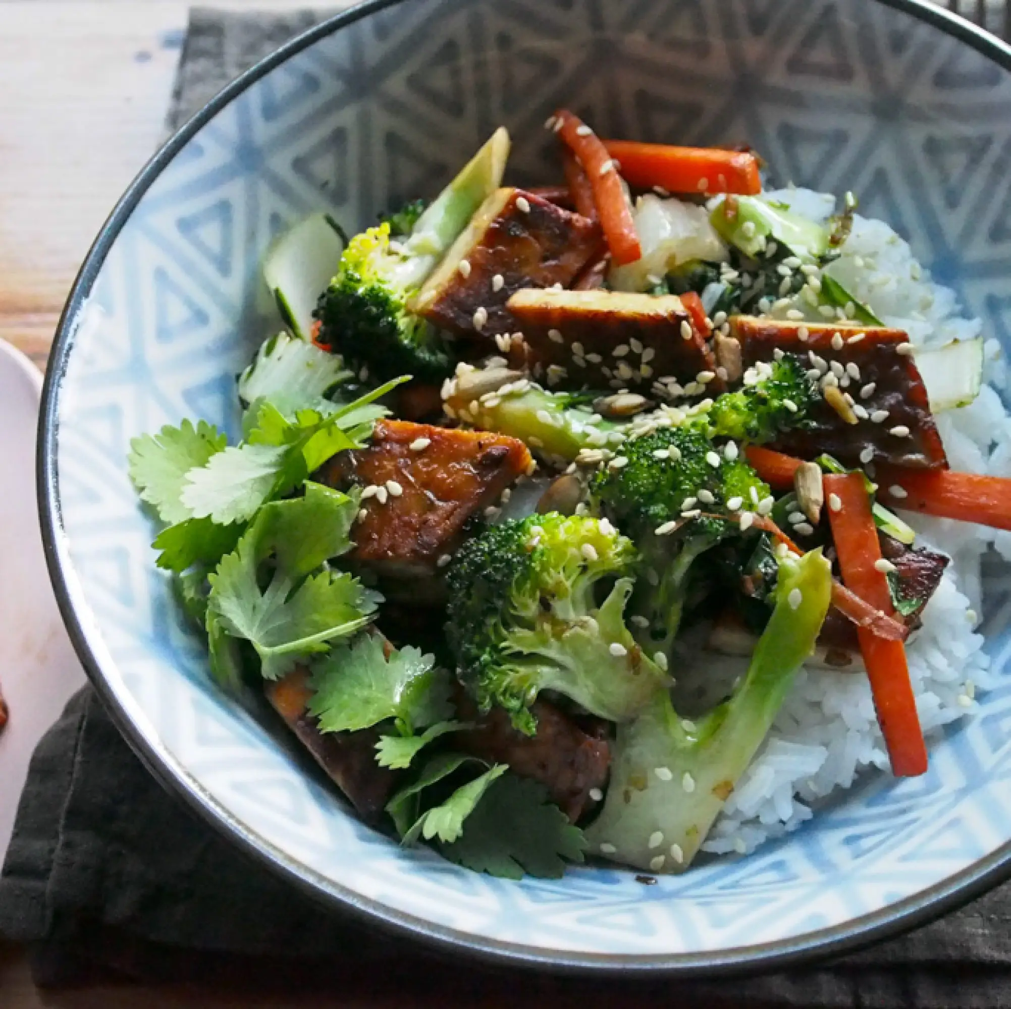 Simple tempeh stir-fry with fresh veg, ginger and tamari.
