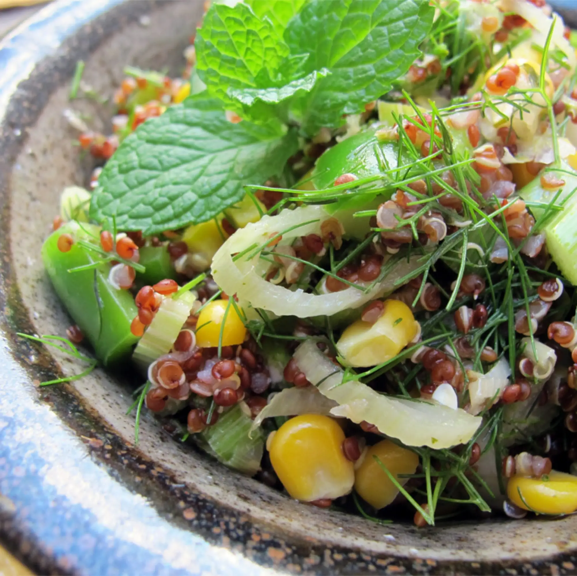 This high protein and tasty salad is a celebration of the array of fresh vegetables available this summer: crunchy fennel and capsicum, hydrating cucumber and lemon, juicy corn and freshly picked mint from the herb garden.