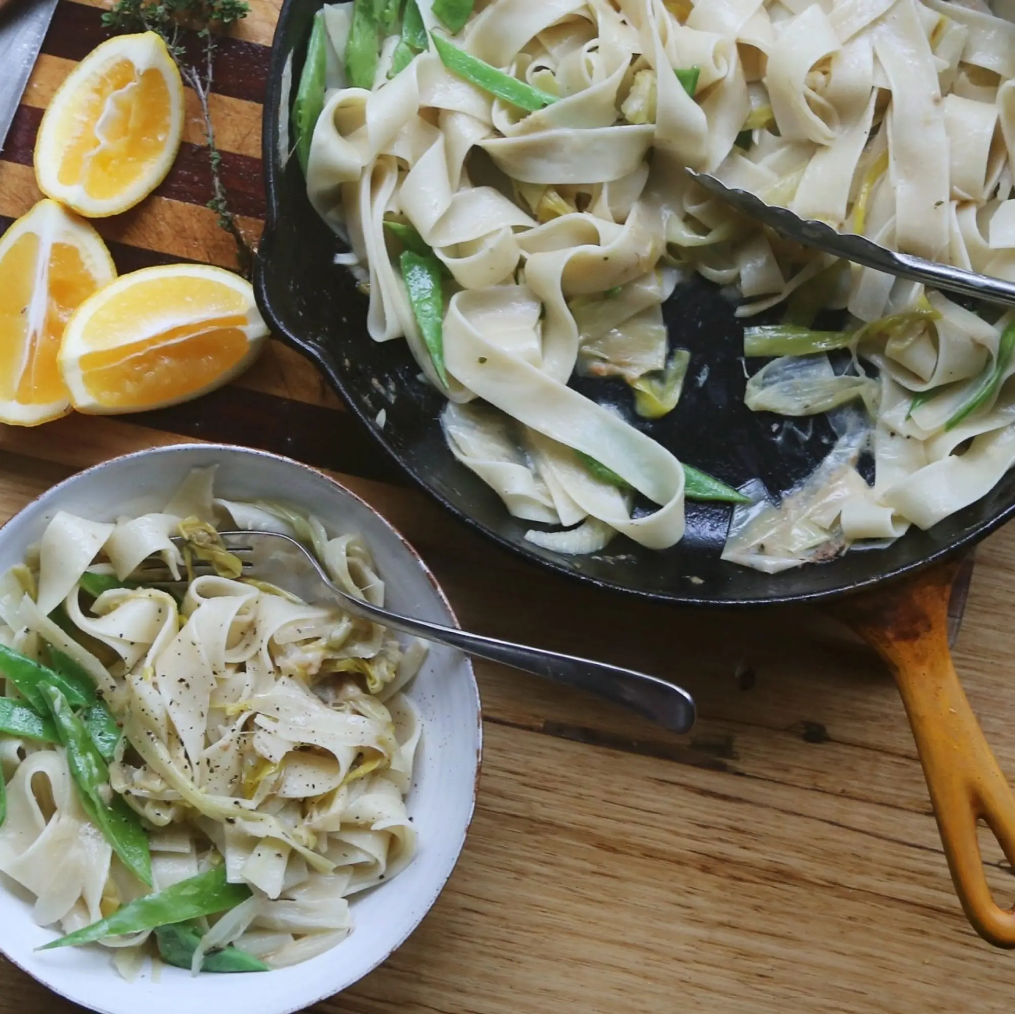 Comforting creamy pasta with slow cooked leeks and fennel. Green snow peas add a little winter crunch.