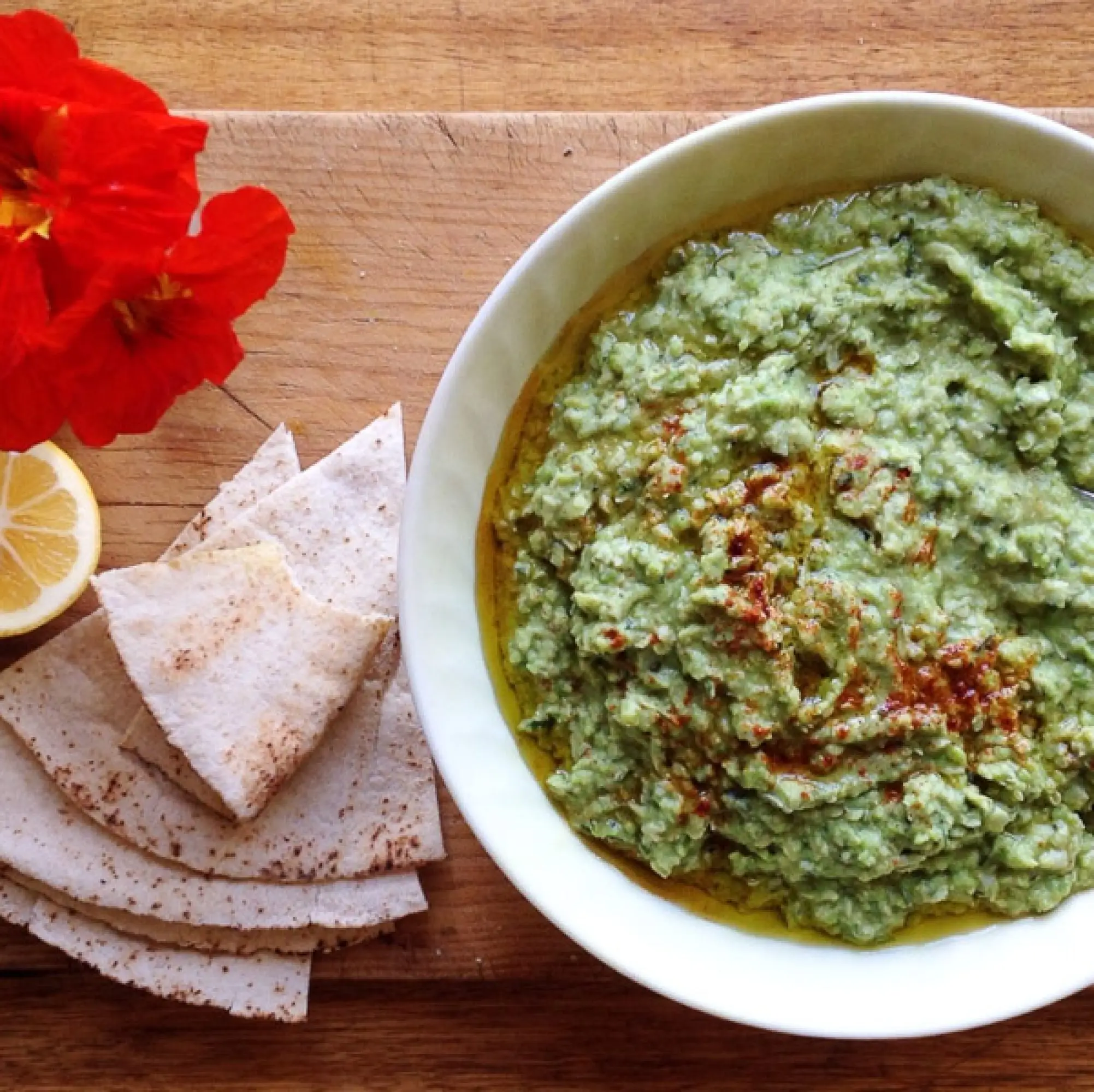 A super delicious broad bean dip, and a great use for the larger pods as the season progresses.