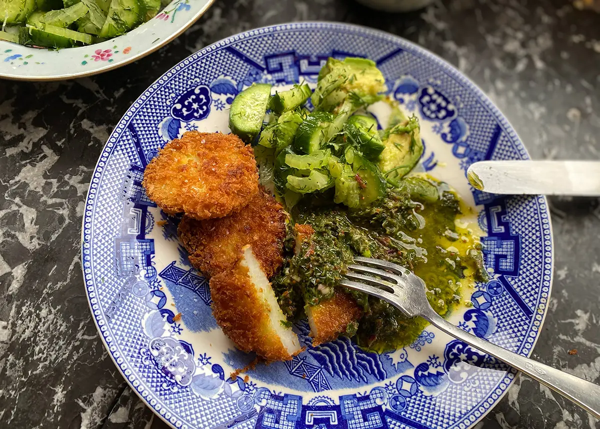 Kohlrabis are friendly kitchen aliens we love experimenting with. In this recipe we crumb and fry them like schnitzels and serve them alongside a salsa verde (made from leaves from the kohlrabi!), and a crunchy, fresh salad.