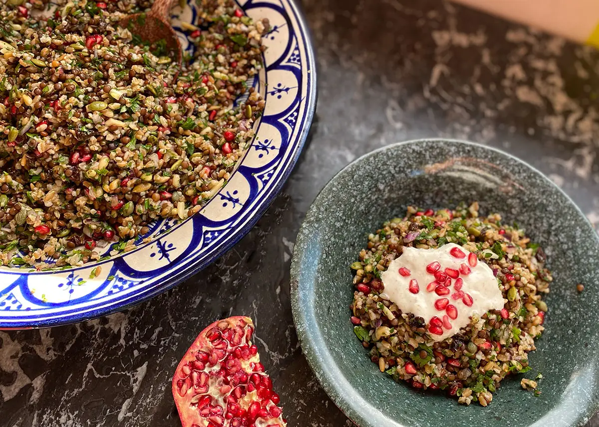 This Cypriot grain salad is mellow and earthy with pops of sweetness from the currants and zingy pomegranate seeds.